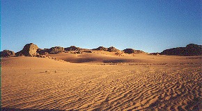 A 20 km au sud d'Arlit une formation rocheuse rompt la monotonie du désert. Une ancienne falaise de grès a été ciselée par le vent et les contrastes thermiques.