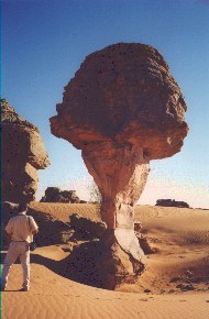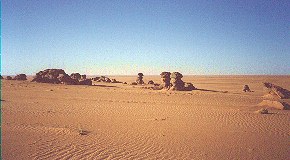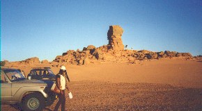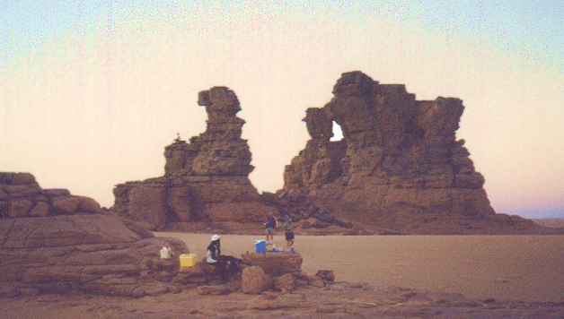A 20 km au sud d'Arlit une formation rocheuse rompt la monotonie du désert. Une ancienne falaise de grès a été ciselée par le vent et les contrastes thermiques.
