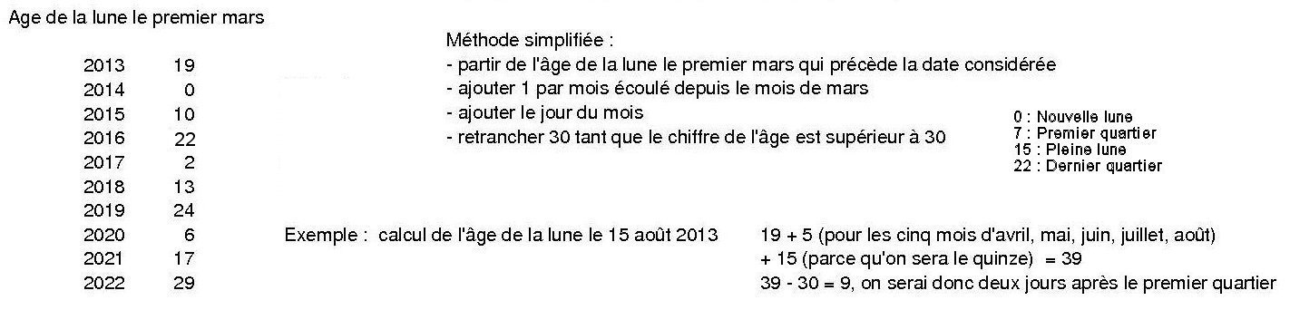 Exemple : l'âge de la lune le 1 mars 2013 = 19; donc l'âge de